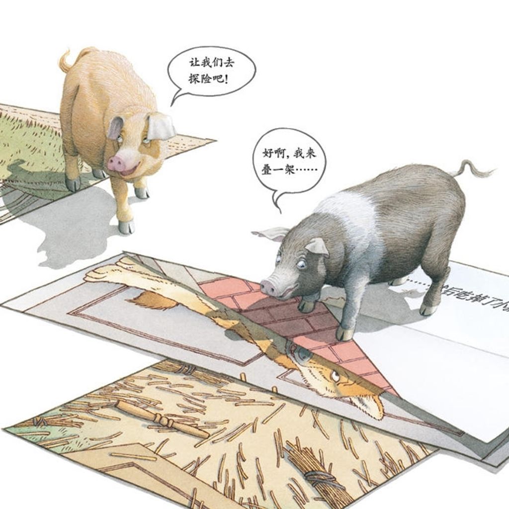 在这本书中,三只小猪经历的每个故事都用了不同的字体和画风,大卫·威斯纳独具匠心的设计和天马行空的想象在此展露无遗!