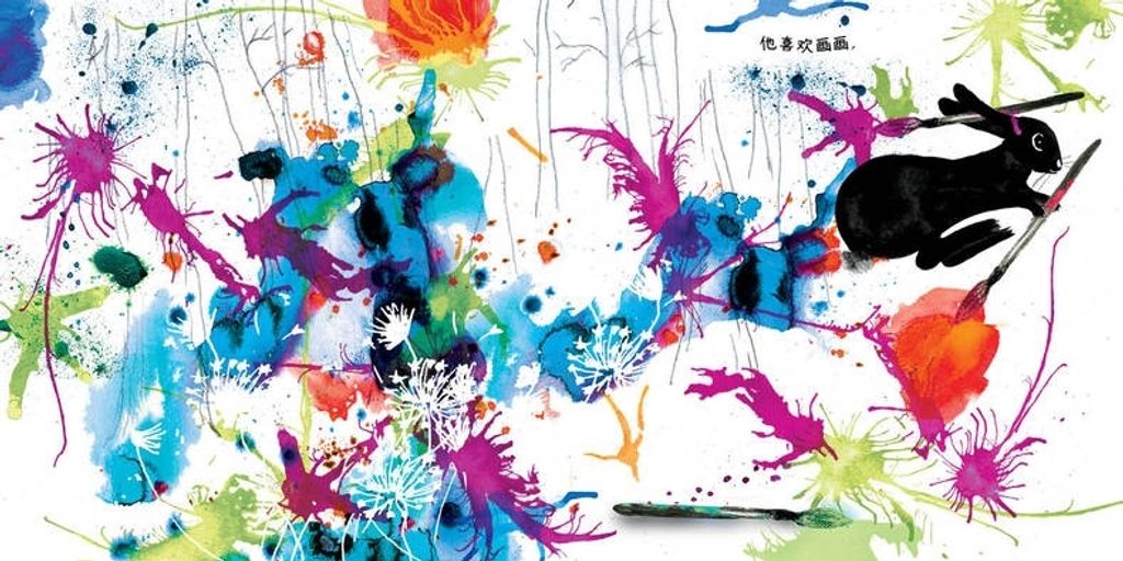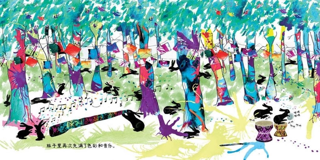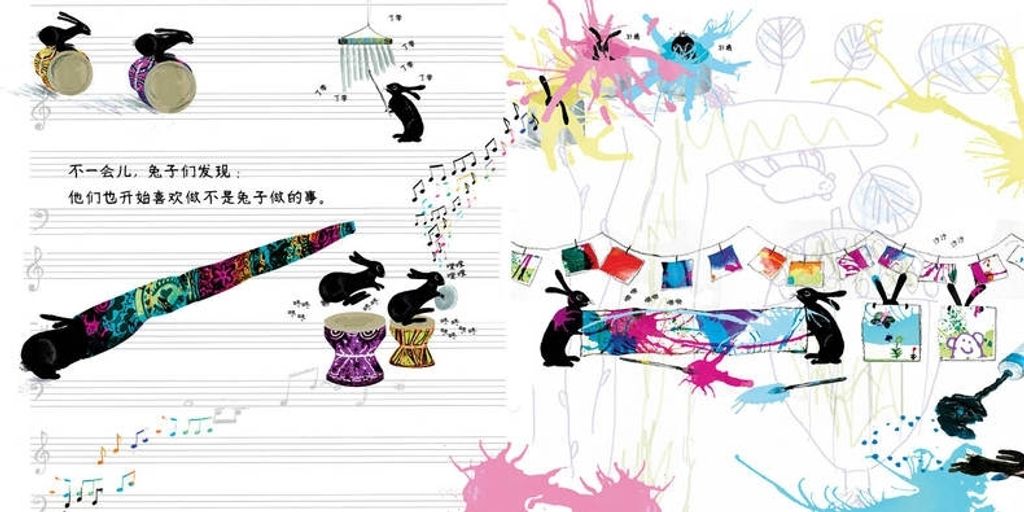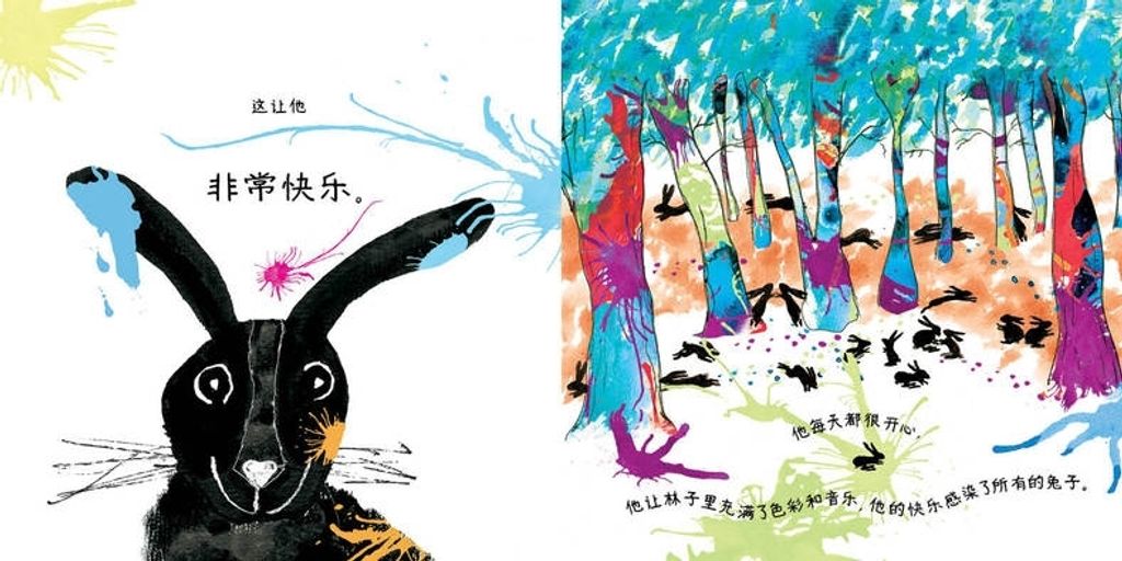 这是一只与众不同的大兔子。他不但喜欢做兔子做的事,譬如蹦蹦蹦、跳跳跳、捻捻胡须、揉揉耳朵……还喜欢做不是兔子做的事,比如画画、玩音乐。他每天都很开心,他让林子里充满了色彩和音乐,他的快乐感染了所有的兔子。有一天,大兔子突然消失了,兔子们到处找不到他,非常难过,林子里变得灰蒙蒙的。但没多久兔子们在一个又黑又深的洞里发现了大兔子留给他们的礼物,于是兔子们也喜欢上了玩色彩和音乐,重新开始了快乐的生活。
