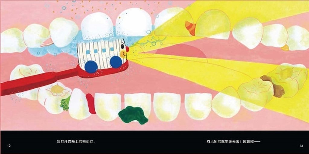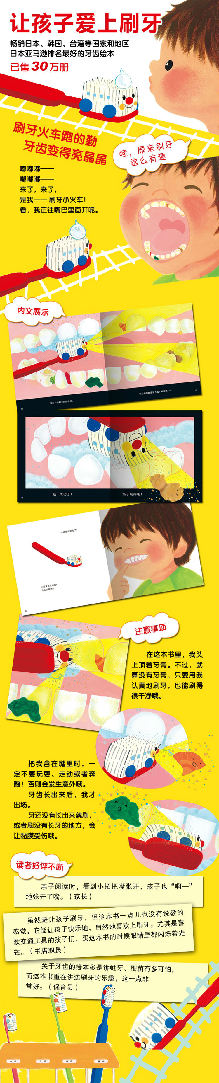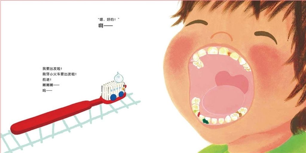 小拓不喜欢刷牙。有一天,刷牙小火车来了,在刷牙小火车的带领下,小拓开启了一场有趣的刷牙之旅。小火车先是开到了小拓的嘴里,接着打开了脸颊的照明灯,嘟嘟嘟——小火车出发了。到达门牙车站后,他们一起左刷刷右刷刷,把牙缝里的残渣刷了出来。后,小拓的牙齿变得亮晶晶的。本书还提到幼儿刷牙时的一些注意事项,有助于培养孩子正确的刷牙习惯。