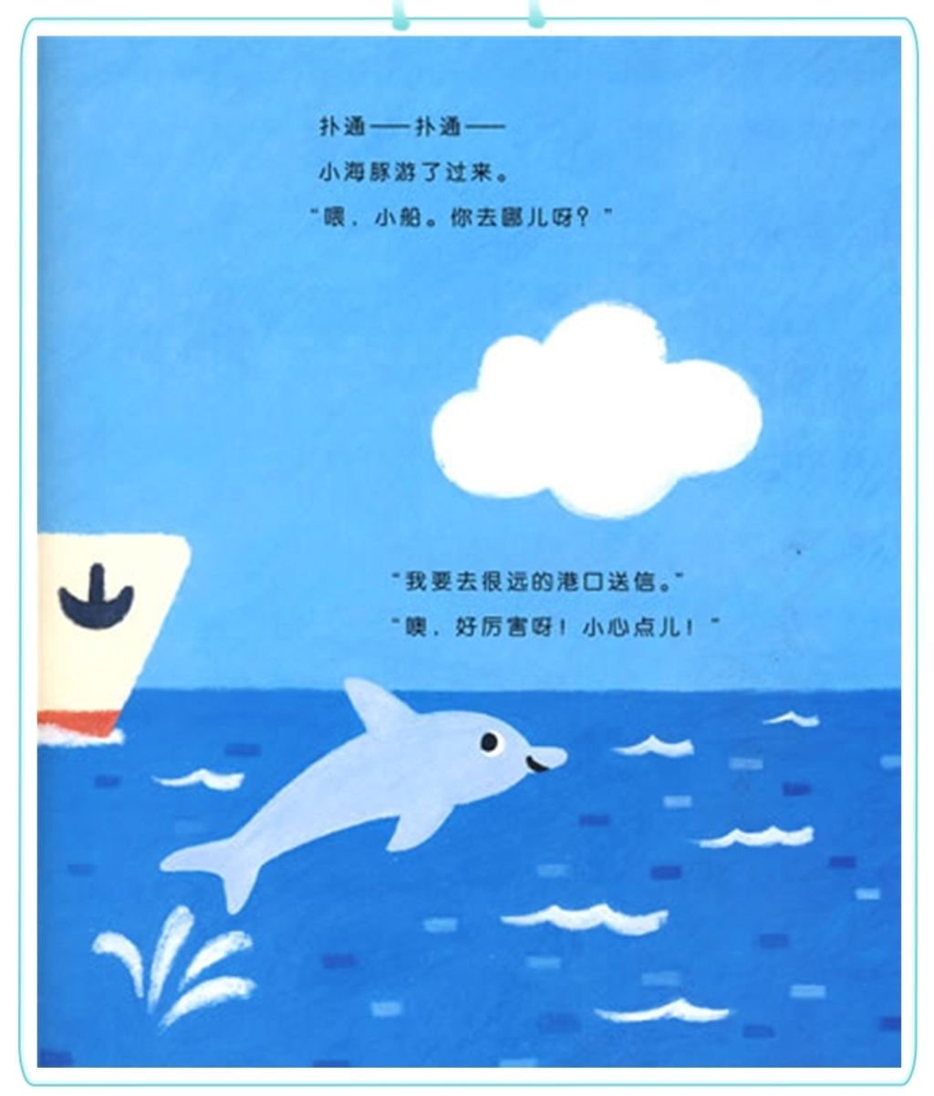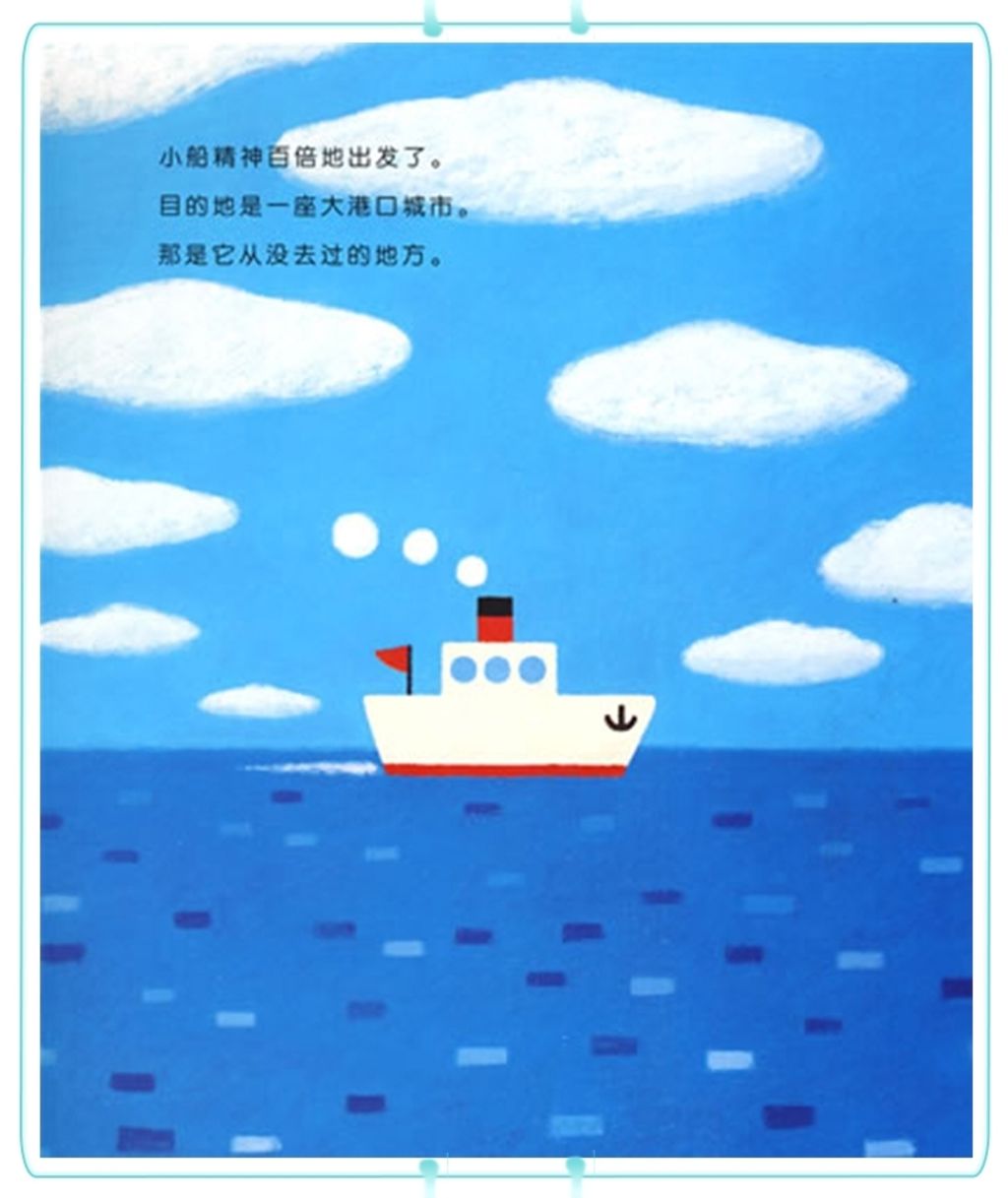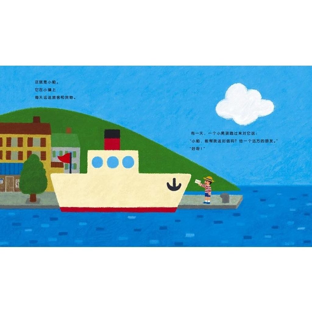 小船带着小男孩寄给朋友的信,从小镇出发了。它的目的地是远方的大港口,那是它从没去过的远方。 辽阔的海面上,清爽的海风、可爱的海豚、形状各异的小岛,也有可怕的风浪和风雨后美丽的彩虹。小船一路使劲朝前开,经历了考验,也欣赏到了未曾见过的美丽景色。忽然,身边出现好多好多船,原来是到岸了。小男孩的信也顺利送达了。