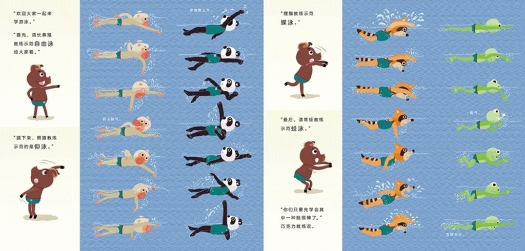 同时,这是一本非常实用的游泳学习指导手册,为了让书中所有学习游泳的方法、要领和姿势都是正确的,赖马夫妇下大功夫,进行了相当仔细的考证,是实际参考儿童游泳教学方法后,研究、整理、绘制而成的。家长或老师们,也可以带着孩子们一起做做热身操,一起动一动,尤其是正在学游泳和想要学游泳的小朋友,千万不要错过! 此外,与以往赖马其他绘本一样,《朱瑞福的游泳课》中也隐藏着超多知识点和超多细节,等着小读者来发现。你知道青蛙、腊肠狗、长吻鳄都是怎么游泳的吗?生气王子、爱哭公主、小珍珠,还有赖马一家人都藏在人群里学游泳呢,你发现了吗?快来找找看吧!