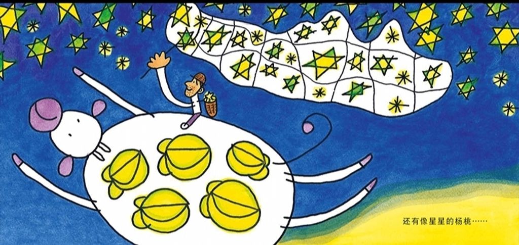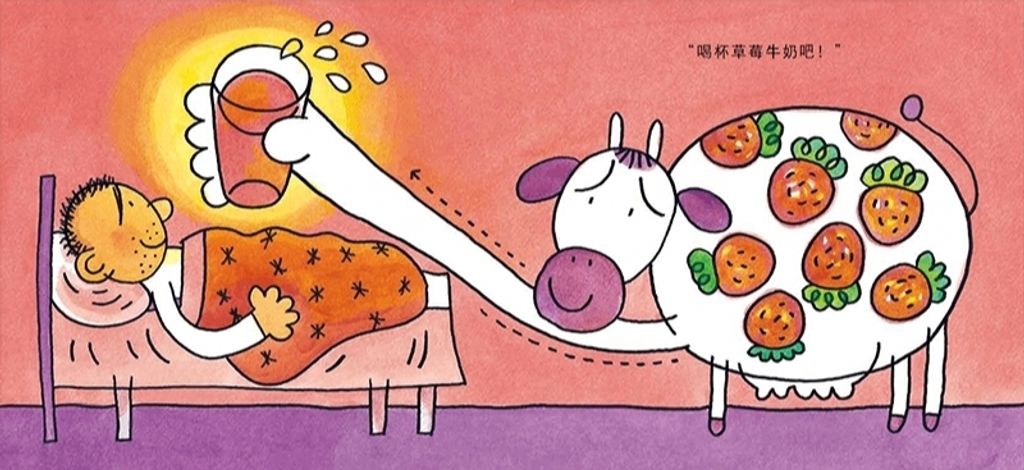 《爱吃水果的牛》住在一个长满水果的森林里,它超爱吃水果,爱到什么地步呢?只要一吃水果就通体舒畅,满足快乐得像在飞翔一样。有一天,吹来一阵冷风,“爱吃水果的牛”的主人和邻居们都生病了,只有这只“爱吃水果的牛”没生病,它很关心大家的健康,于是从身体里挤出“草莓牛奶”“木瓜牛奶”、“西瓜牛奶”……主人喝了这些水果牛奶之后,就康复了,而邻居们也跟着开始吃起水果,大家的病也都好了,从此以后,每个人也像“爱吃水果的牛”一样,变成了“爱吃水果的人”。