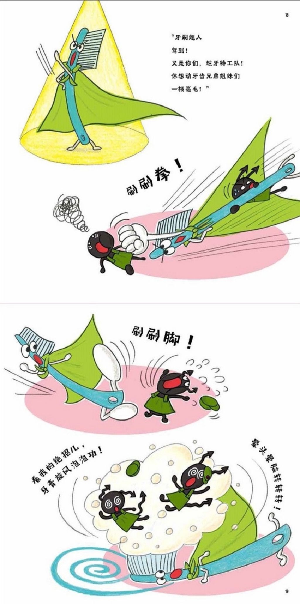 这本书讲述了生活在嘴巴屋里的牙齿兄弟姐妹一家的故事。牙齿兄弟姐妹们一起吃着爱吃的咖喱饭,里面有土豆、胡萝卜、牛肉、洋葱,食材丰盛。饱餐一顿后,牙刷超人帅气登场,用刷牙的动作把每一个牙齿清理干净。然后,蛀牙特工队带着各类零食如薯片、可乐、糖果、冰淇淋等来破坏牙齿……后还是牙刷超人前来解救了牙齿一家!