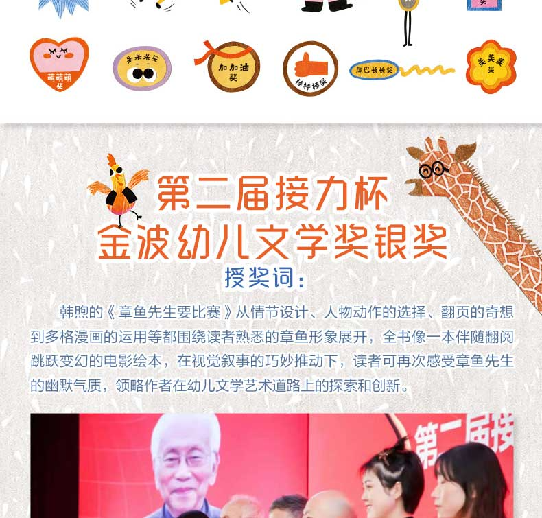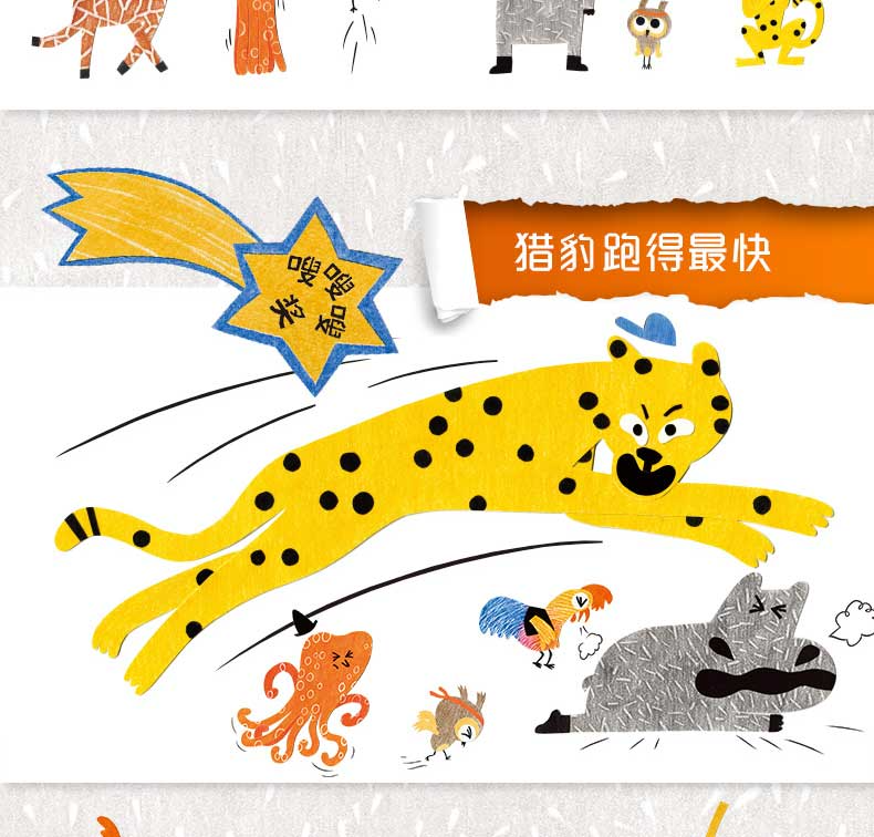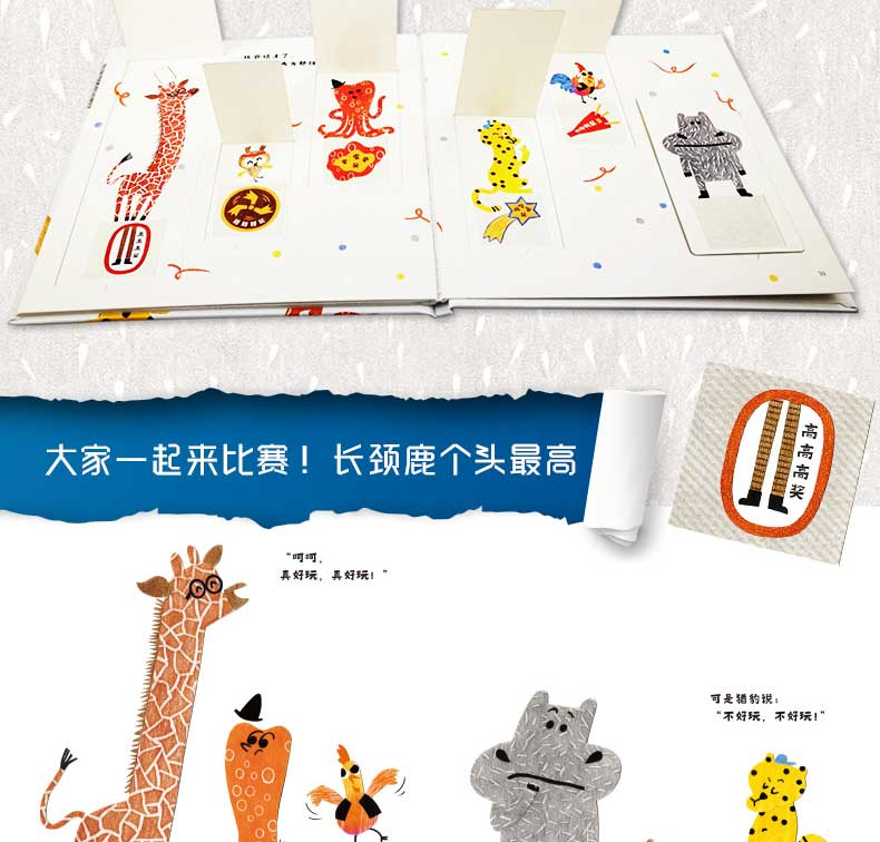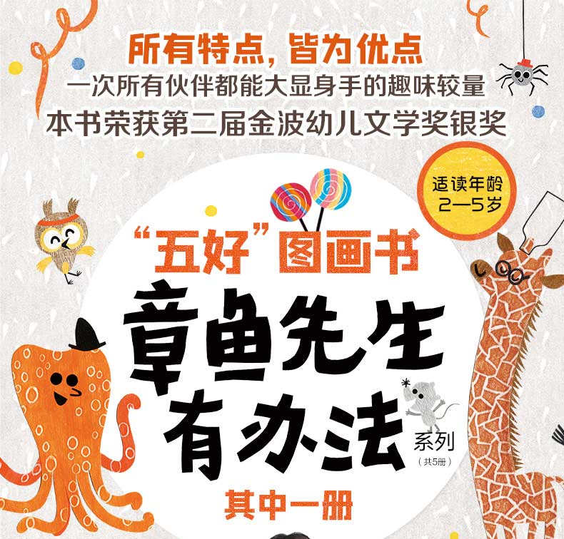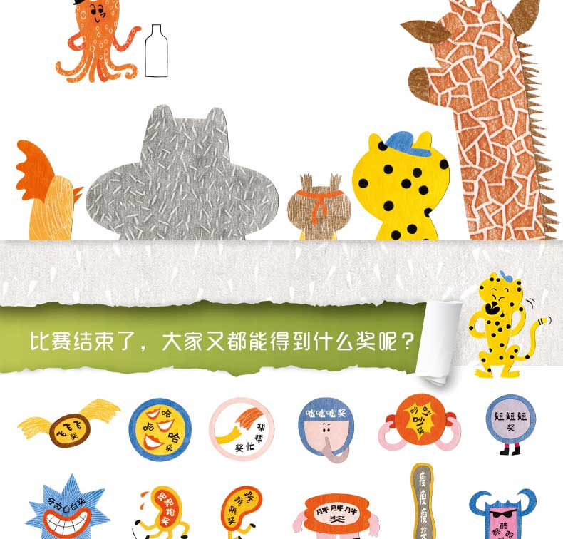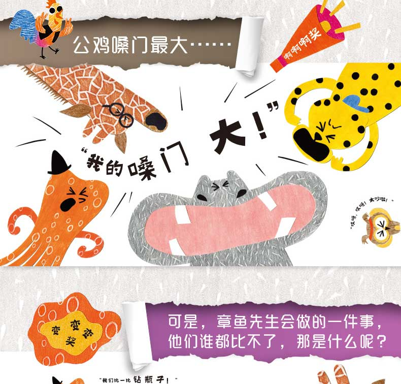 大家一起来比赛! 长颈鹿个头高,猎豹跑得 快,公鸡嗓门 da……可是,章鱼先生会做的一件事,他们谁都比不了,那是什么呢?比赛结束了,大家又都能得到什么奖呢? 一本献给2-5岁孩子的认知启蒙图画书。各种形式的比赛展现了各种动物的特性, 告诉孩子,每个人都是 的,都有自己 闪光的地方。