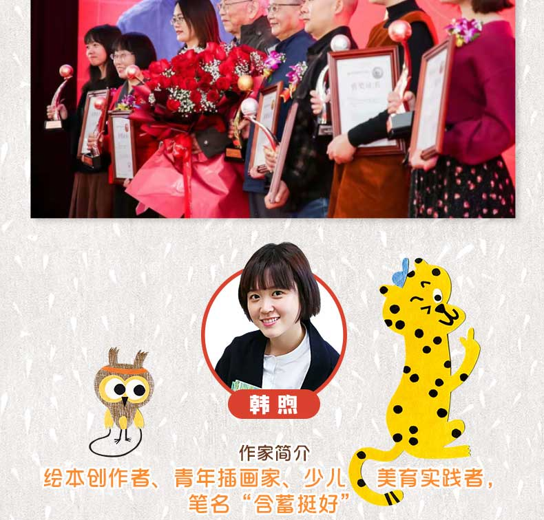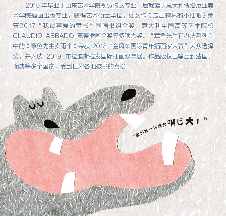 韩煦 绘本创作者、青年插画家、少儿美育实践者,笔名“含蓄挺好” 2010 年毕业于山东艺术学院视觉传达专业,后就读于意大利博洛尼亚美术学院插画出版专业,获得艺术硕士学位。处女作《走出森林的小红帽》荣获 2017“我 喜爱的童书”图画书组金奖、意大利全国高等艺术院校 CLAUDIO ABBADO 竞赛插画金奖等多项大奖。“章鱼先生有办法系列”中的《章鱼先生卖雨伞》荣获 2018“金风车 青年插画家大赛”大众选择奖,并入选 2019 布拉迪斯拉发 插画双年展。作品版权已输出到法国、瑞典等多个 ,受到世界各地孩子的喜爱。