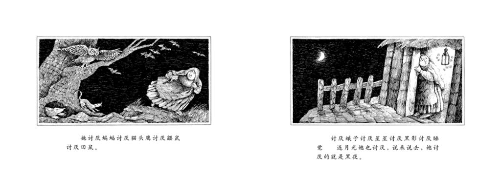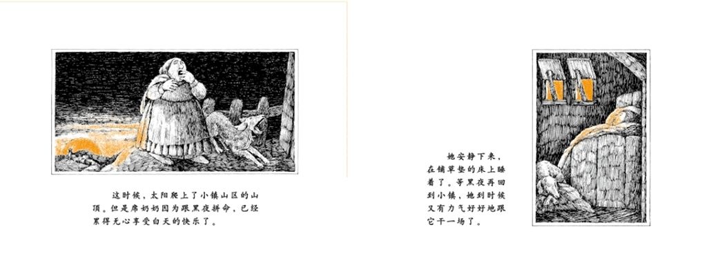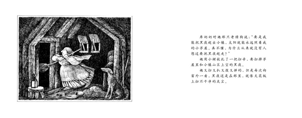 因为讨厌黑夜,席奶奶千方百计要赶走黑暗,她用扫帚扫、用麻布袋装、用大锅来煮、用藤蔓来捆、用剪刀剪、丢给猎狗吃、沉到屋后的井里,甚至对黑夜吐唾沫……一整夜,她用了整整十七种方法,结果怎么样呢?黑夜还是黑夜,一点也没有改变。当太阳光芒四射地出现、黑夜自己消失的时候,席奶奶和她的伙伴——那条无可奈何地陪着她辛苦了一夜的大狗,都累得顾不上欣赏和高兴,而是昏昏沉沉睡去了。