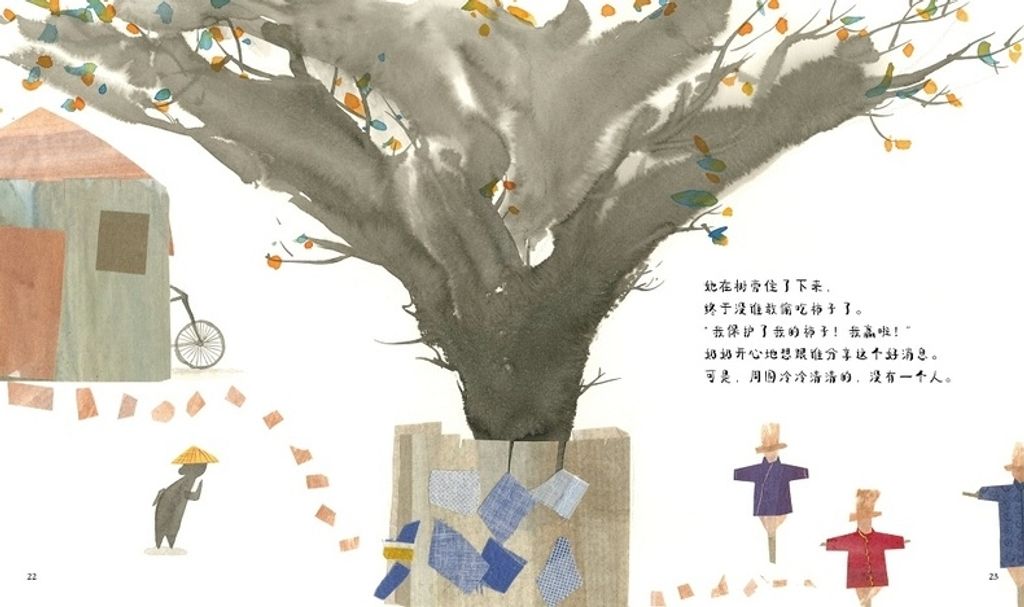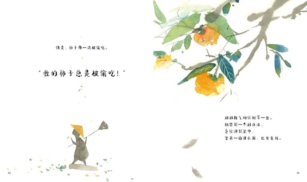 这是一本适合2—6岁儿童阅读的传递现代分享观念的图画书,讲述了一位独居老人守护一棵柿子树的故事。秋天刚到,奶奶的柿子就被偷吃了,她在树旁发现了大大小小的脚印,从强壮的、到活泼的小鹿,再到小小的老鼠……奶奶与各种臆想中的动物们斗争,她的生活也变得热闹起来。所以,当她保护了柿子,赶走了动物们,高兴过后却有些失落。于是,奶奶做了一个暖心的举动,把树上剩下的柿子留给了动物们。