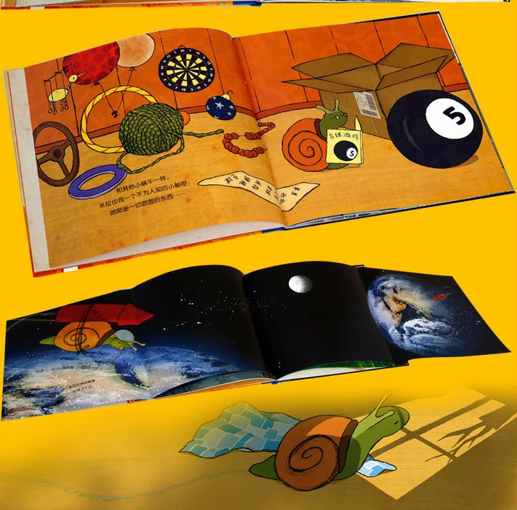 《追寻幸福的蜗牛》中小小蜗牛如何找到自己大大的幸福……小蜗牛米拉痴迷一切圆圆的东西,她每天乐此不疲地寻找着各种“圆”。而每当仰望天空中的圆月时,米拉激动得睡不着觉。终于有,米拉决定去月亮上看看。她和好朋友蚯蚓乐乐一起为实现这个愿望而不懈地努力着……什么?一只蜗牛要登月?这真是太惊天动地了!故事中这只名叫米拉的小蜗牛为了所痴迷的“圆”,尝试了种种方法,付出了万般艰辛,终于用智慧和坚持不懈的努力圆了自己的梦想。