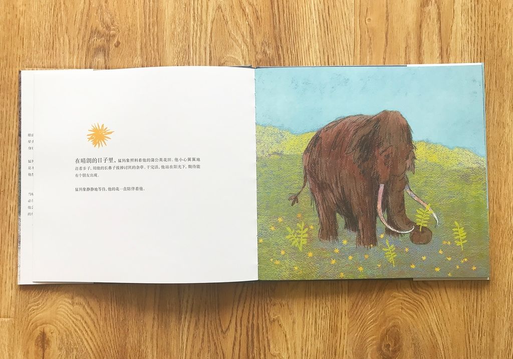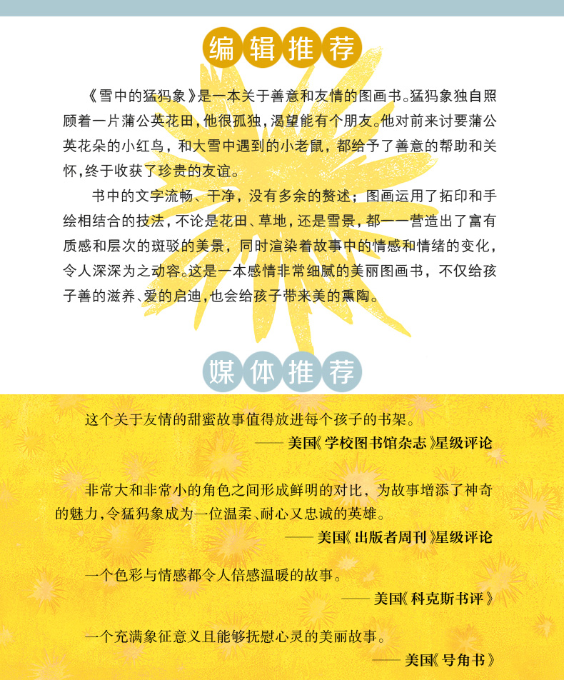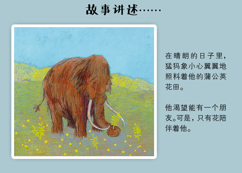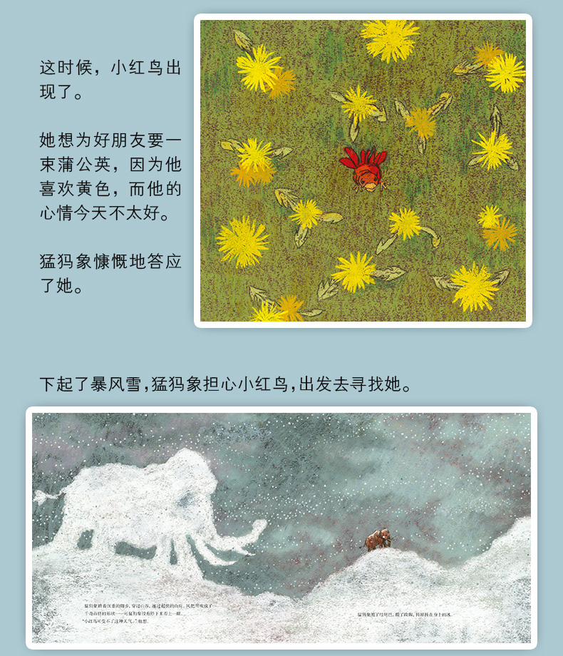 一头孤独的猛犸象种了一片蒲公英花田,他渴望能有个朋友。一天,来了一只小红鸟,想为自己的好朋友讨一束蒲公英,安慰他低落的心情。猛犸象慷慨地送给了小红鸟。过了不久,下起大雪,猛犸象担心小红鸟,出发去寻找她。在路上,猛犸象遇见一只小老鼠,帮助他躲避风雪。原来,小老鼠就是小红鸟的好朋友。接着,他们两个一起去寻找小红鸟,却在一片雪地当中,发现了几朵小小的蒲公英……