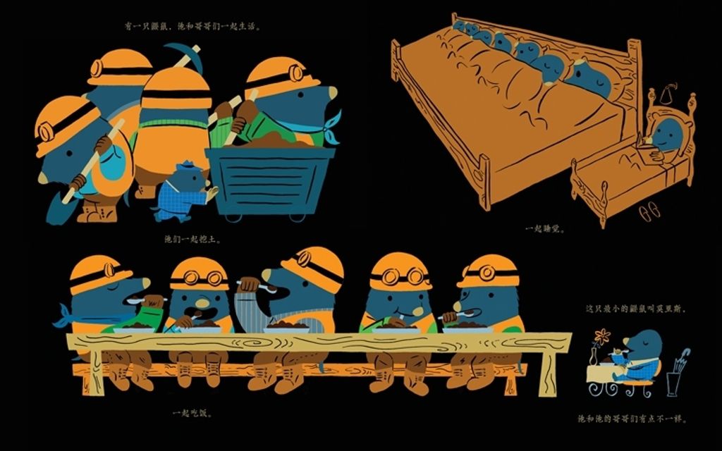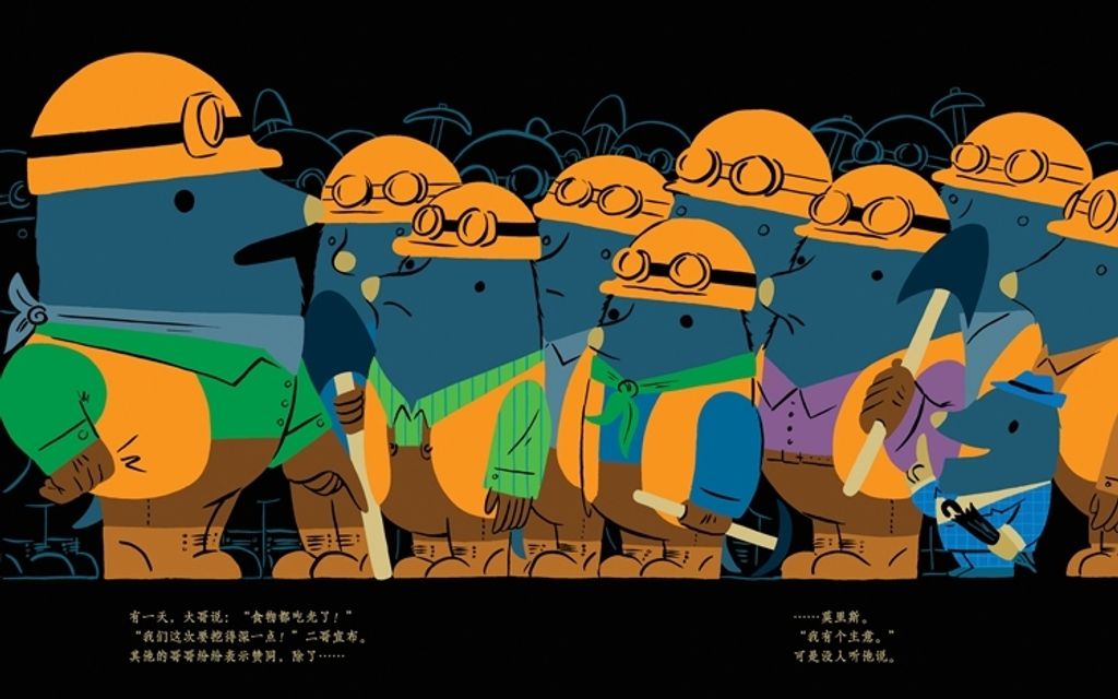 莫里斯和哥哥们一起在地底下生活,但他总是有点不一样。他穿西装、戴礼帽,随身带着雨伞,一个人在小桌子上吃饭,一个人睡小床,一个人看书。当他们吃光了食物,哥哥们决定往更深的地底挖时,莫里斯鼓起勇气,做了一件哥哥们从来没做过的事…… 国际作家、插画家丹·雅卡理诺用富有节奏的语言和风格鲜明的插画讲述了一个动人的故事,一定会赢得所有读者的心。