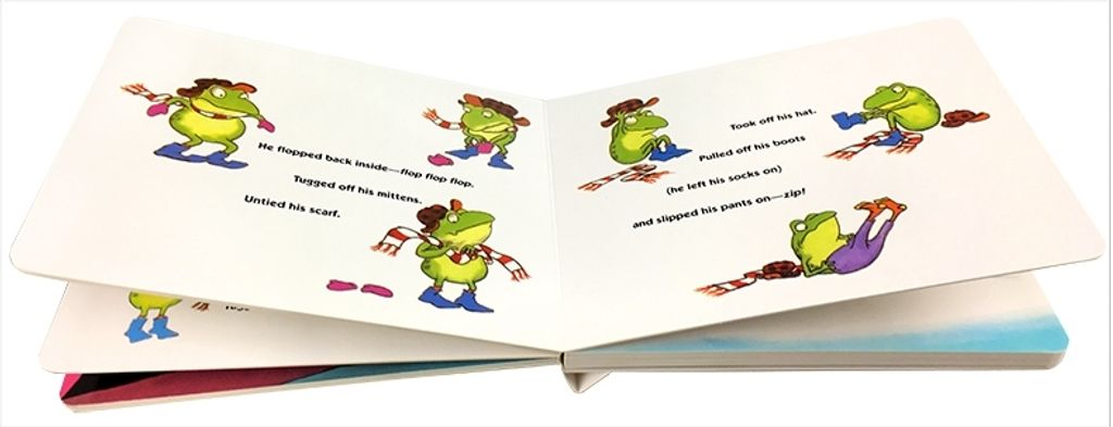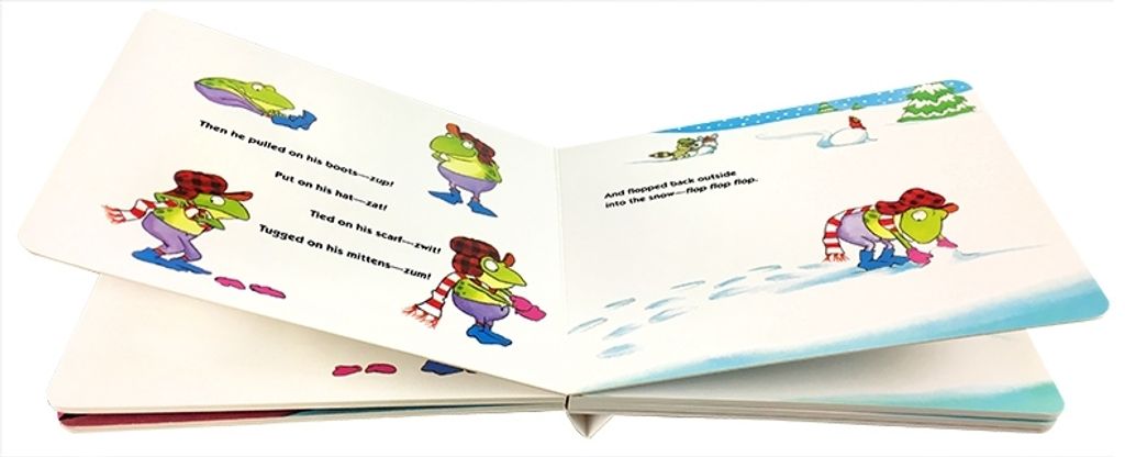 Rambunctious Froggy hops out into the snow for a winter frolic but is called back by his mother to put on some necessary articles of clothing.
