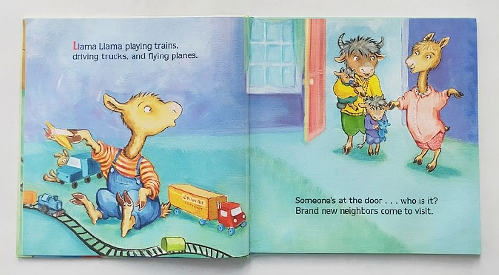 Llama Llama has new neighbors! Nelly Gnu and her mama stop by for a play date, but Llama's not so sure it's time to share all his toys. Maybe just his blocks? It could be fun to make a castle with Nelly . . . But wait--Nelly has Llama's little Fuzzy Llama! The fun turns to tears when Fuzzy Llama is ripped in two, "all because of Nelly Gnu!" Mama comes to the rescue and fixes Fuzzy, but she makes it clear: "I'll put Fuzzy on the stairs, until you're sure that you can share."