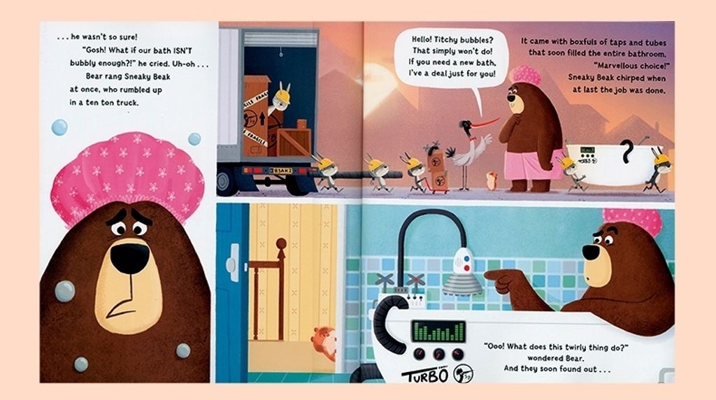 Is your bath BUBBLY enough? Is your bed BOUNCY enough? Is your cereal CRUNCHY enough? Don't delay - call Sneaky Beak TODAY for deals beyond your wildest dreams! Bear and Hamster are perfectly content ... until gadget-mad salesman, Sneaky Beak, arrives. But when they finally have it all, will Bear and Hamster really be happier? A hilarious story with an important message about the pitfalls of materialism.