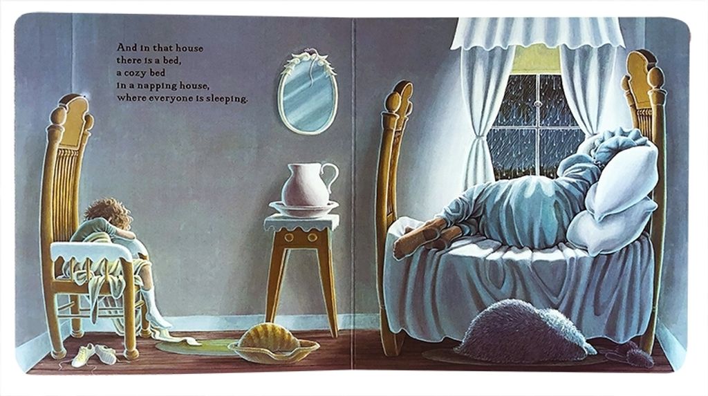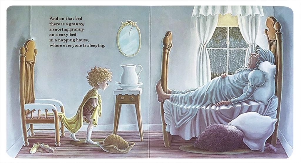In the napping house is a cozy bed piled high with a snoring granny, a dreaming child, a dozing dog, a snoozing cat, and a slumbering mouse. What could be more comfy?