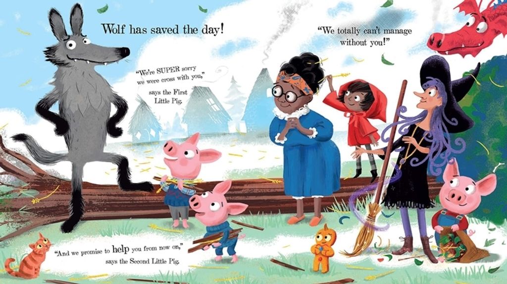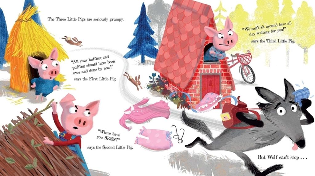 The Big Bad Wolf is late AGAIN and is ruining stories as he rushes through the forest to Grandma's house. When the Three Little Pigs get seriously grumpy AGAIN, Wolf tells them he's had ENOUGH. There will be no more HUFFING and PUFFING from this Big Bad Wolf. The fairytale characters aren't worried – they can totally manage without him!