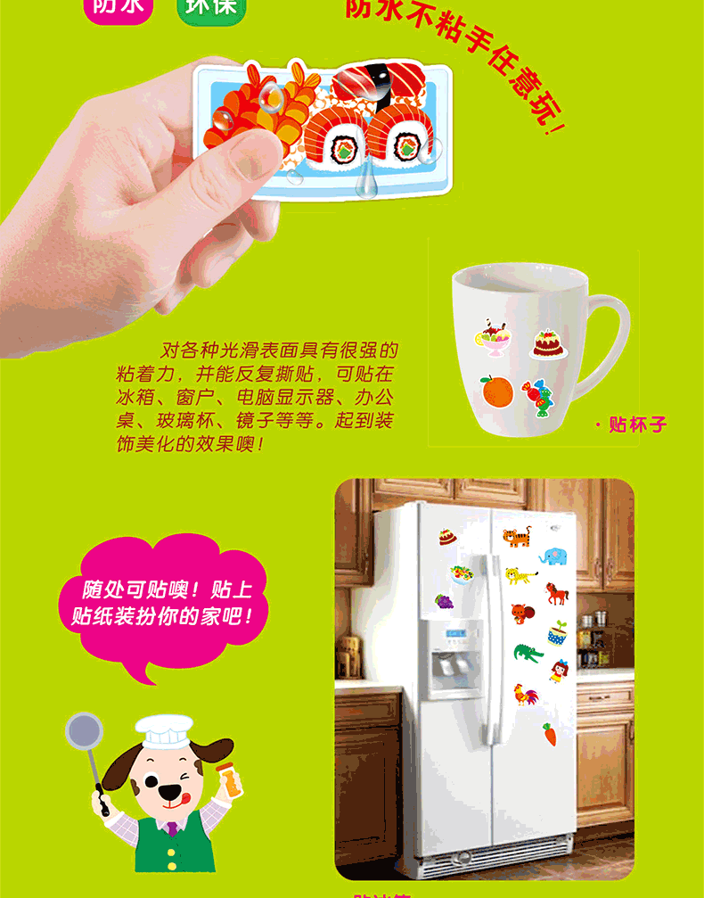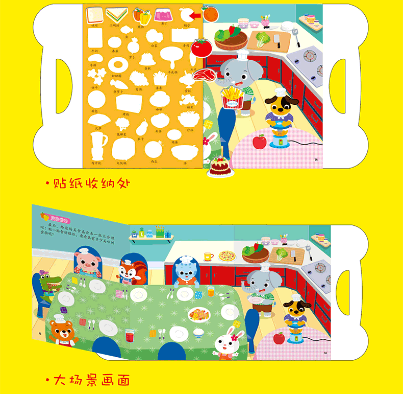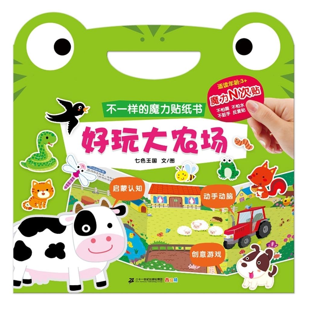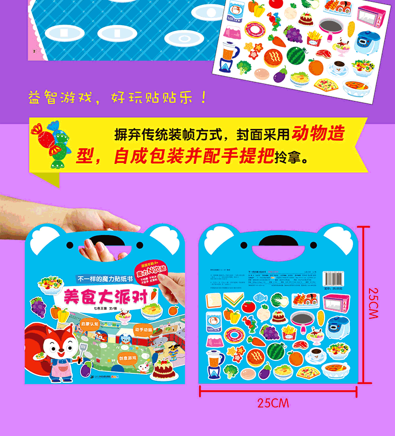 《不一样的魔力贴纸书》选择孩子喜爱的六个主题,每本五个好玩的游戏场景,在游戏中学习认知,最后的大拉页将内容归纳在一个丰富大场景里!循序渐进地让孩子在尽情享受贴纸游戏的同时,牢固地奠定幼儿启蒙教育基础。采用特殊工艺硅胶贴纸,比一般贴纸厚,方便小手拾起。不仅可以在书上反复贴,还能随意贴在墙上,冰箱上……任何你想贴的地方。最特别之处在于,摒弃传统贴纸书的装帧包装方式,封面自成包装并可手提。贴纸初始收纳于封底,更好地呈现给读者。